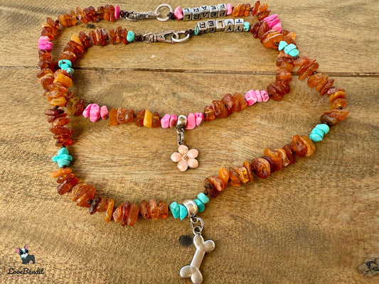 Bernsteinkette "Bernsteinjung" für Hunde mit türkisfarbenen Natursteinen