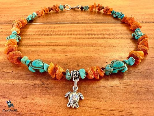 Bernsteinkette „Turtle Love“ – Hundeschmuck mit Schildkröte & Türkis