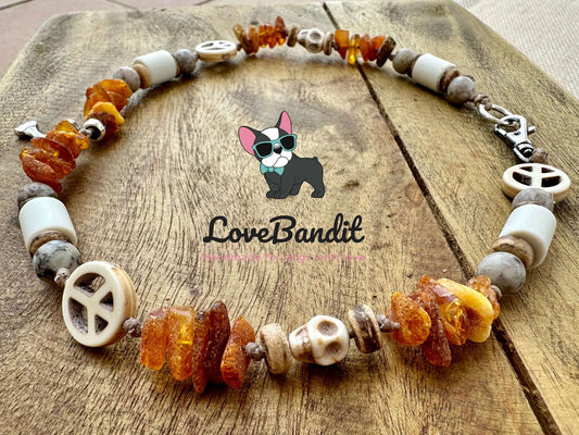 Bernsteinkette für Hunde mit EM-Keramik, Totenköpfen & Peace