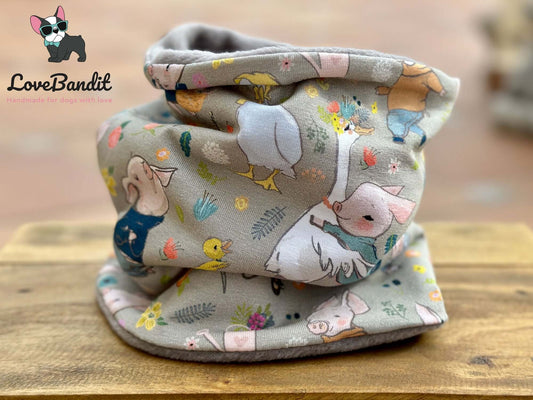 Hundeloop Hundeschal Frühlingsgarten Gans Schwein Ente Blumen graugrün