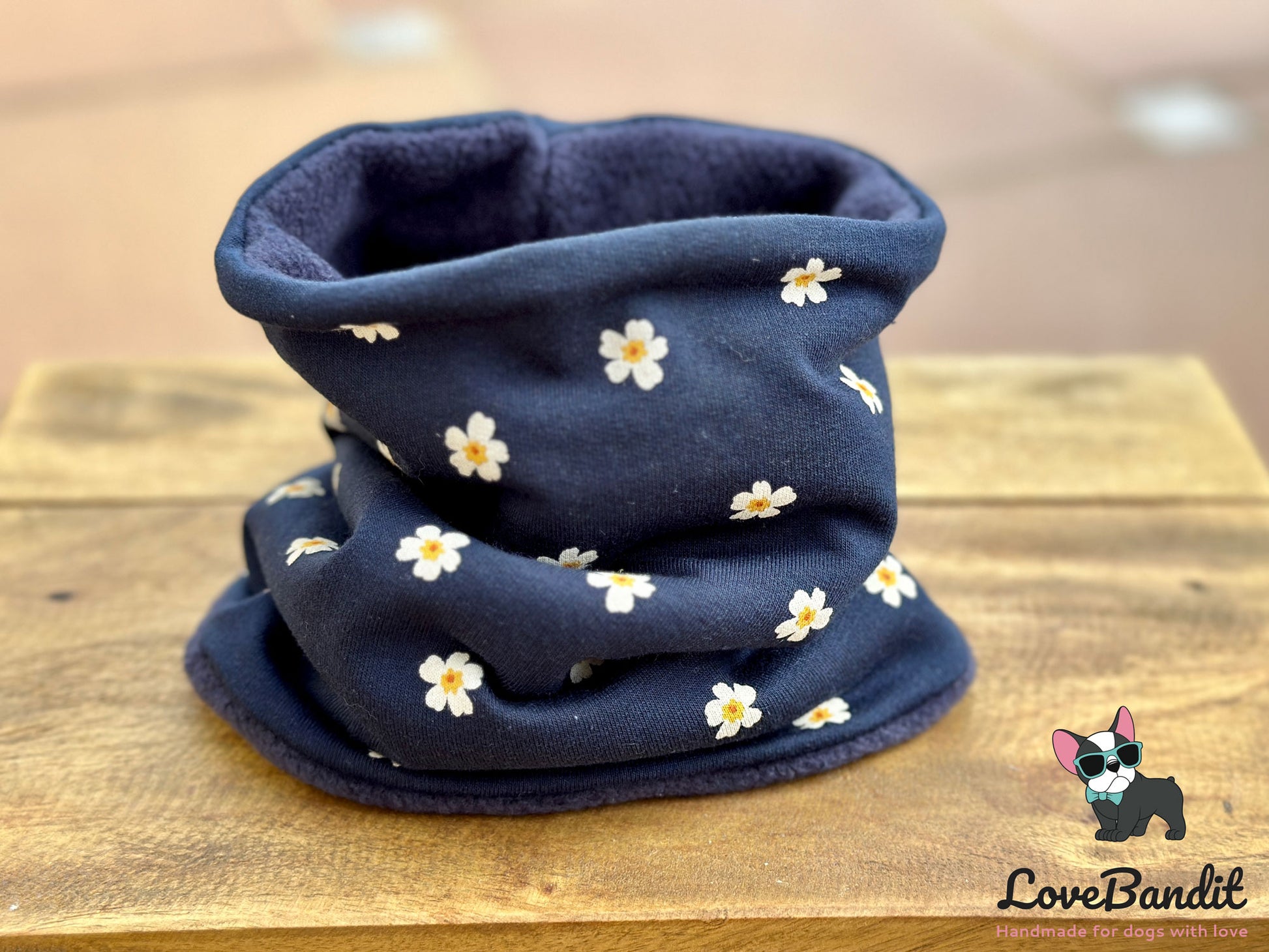 Süßer Hundeloop Hundeschal mit Gänseblümchen in dunkelblau. Außen Oekotex Bio Baumwolle, innen kuscheliger Teddyplüsch oder Fleece.