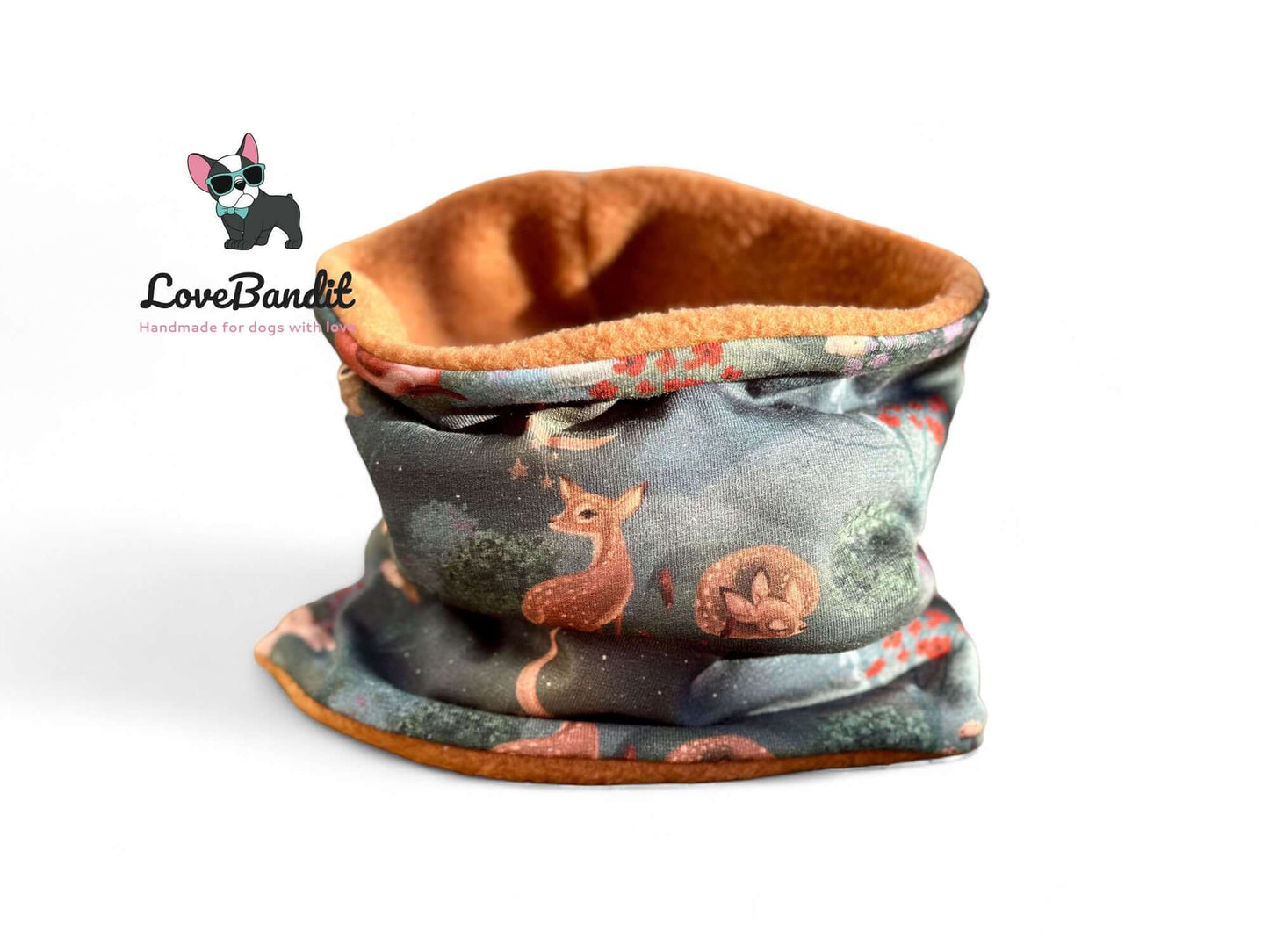 Süßer Hundeloop Hundeschal mit Waldtieren (Reh, Hase, Eule, Frosch) in grünblau. Außen Oekotex Bio-Baumwollstoff, innen Kuschelfleece oder Teddyplüsch.
