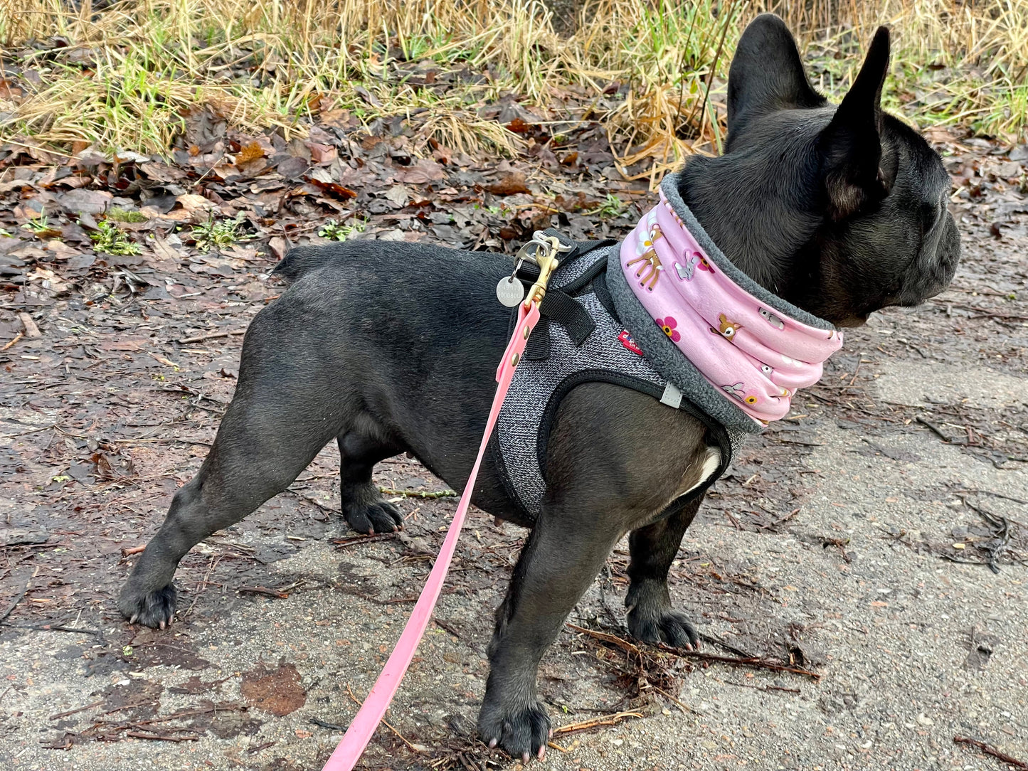 Hundeloop Hundeschal Rehkitz Vögelchen Schmetterlinge türkis - eine nützliche Unterstützung deines Hundes in der kalten Jahreszeit.